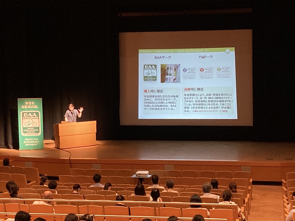 講演では、鹿児島県内の自転車事故の特徴や事故データに触れ、全国の自転車通学指導事例や年齢に合わせた指導法を紹介しました。また、見落とされがちな自転車自体の安全性(BAAマークについて)の大切さについて解説しました。