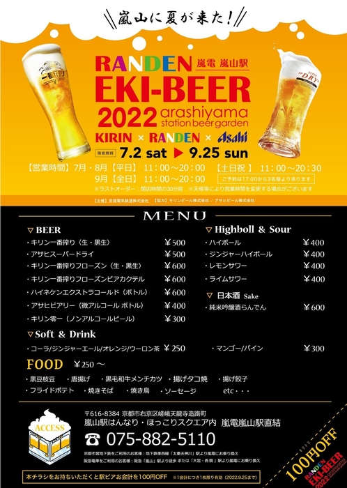 今回開催の「RANDEN EKI-BEER 2022」は、同駅の商業施設「嵐山駅はんなり・ほっこりスクエア」が、本年10月にオープン20周年を迎えるにあたり、キリンビール株式会社(本社:東京都中野区、社長:堀口英樹)とアサヒビール株式会社(本社:東京都墨田区、社長:塩澤賢一)の2社に参画いただき、にぎやかに展開します。「RANDEN EKI-BEER 2022」で、暑い2022年の夏を、自然豊かな嵐山で心ゆくまでお楽しみください。