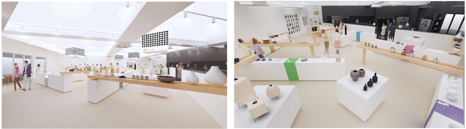 白色をベースにした空間に、県産品の中でも伝統的なものと革新的なものを異なる展示方法で表現し、美術館のように展示することで、視覚、感覚の両面から商品を訴求。