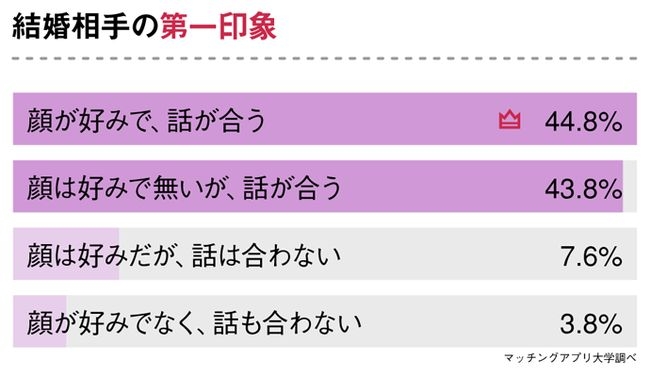 この数字からは、第一印象を「顔や見た目」で判断せず、「話が合うか」で判断した方が結婚する相手を見つけやすいということが推察されます。