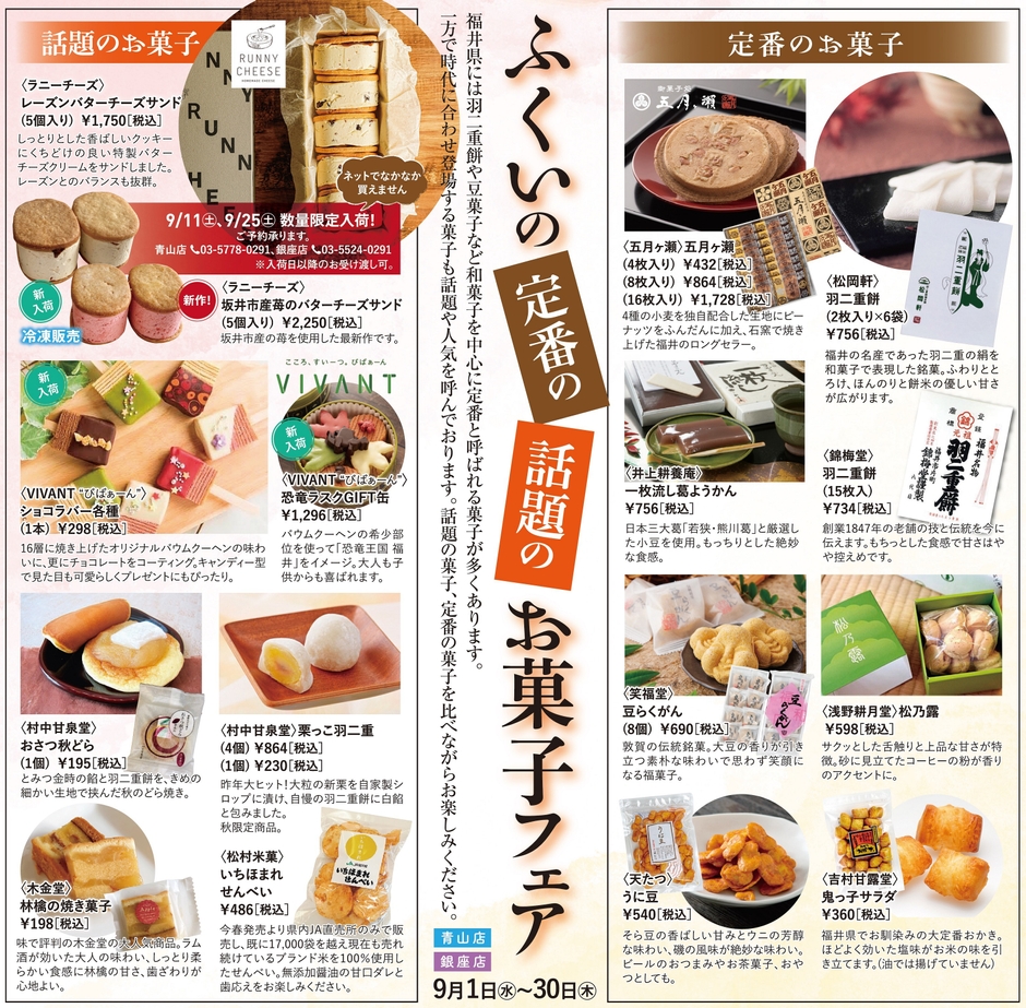 福井県アンテナショップの青山店「ふくい南青山291」、銀座店「食の國 福井館」では9月1日(水)から9月30日(木)までの期間「ふくいの定番のお菓子・話題のお菓子フェア」を開催しております。