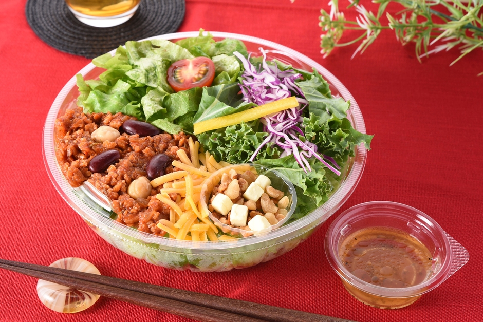 本商品は、本年6月22日に発売された『国産ケールと7種野菜のグリーンサラダ(シーザーサラダドレッシング)』の好評をうけ、Salad Cafe監修シリーズの第2弾として開発されました。今回は、暑い夏にぴったりなスパイシーな味わいのサラダです。国産ケールやレタスに、大豆ミートを使用したチリミート、チェダーチーズをトッピングし、食感のアクセントにくるみやアーモンドを添えました。甘酸っぱいハニービネガードレッシングが、スパイシーなチリミートとよく合います。