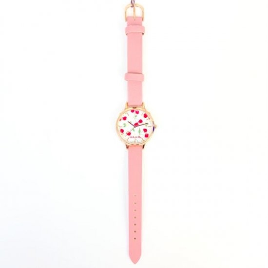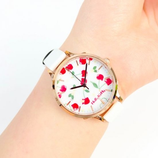 ブラックのベルトにゴールドのフレーム、そして文字盤にはキティちゃんの形のさくらんぼがデザインされた腕時計です。