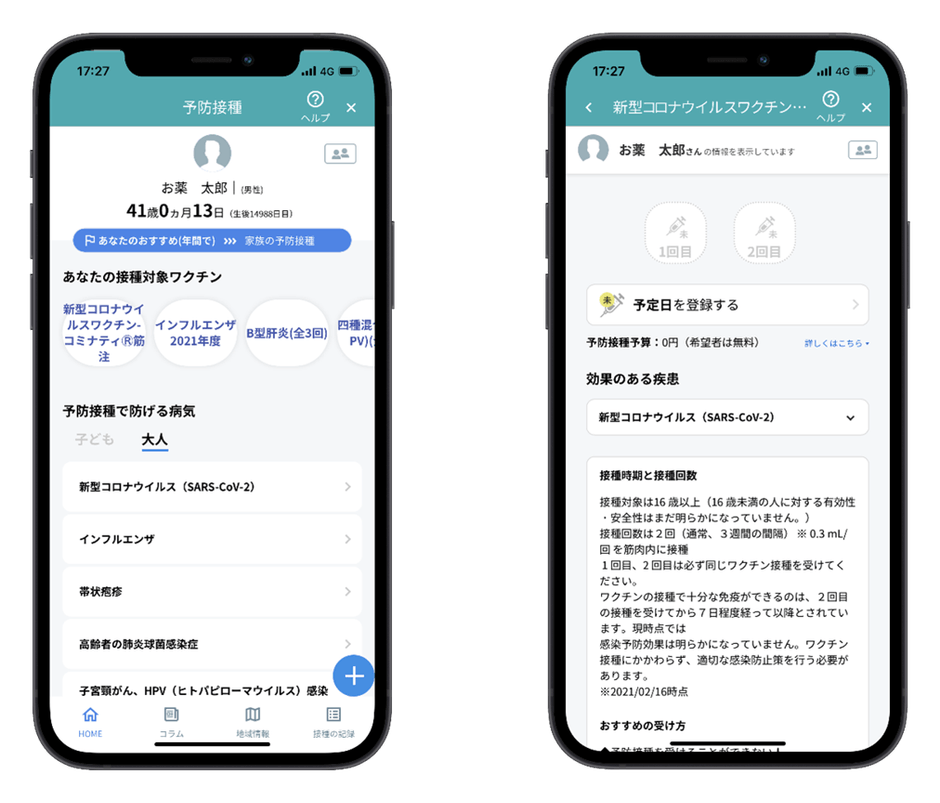 2020年11月に年齢層別に接種対象ワクチンを表示する、予防接種スケジューラー機能をリリースしました。今回「新型コロナウイルス」の項目を追加。接種予定日、接種有無、接種場所、接種ワクチンの記録、登録しているユーザーとの情報共有が可能です。