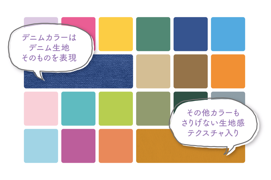 デニムカラーは、デニム生地そのものを表現。その他のカラーにもさりげない生地テクスチャを入れて、シールのペッタリ感を軽減しています。