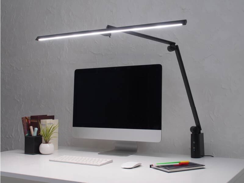 アーム部分は角度を調整する関節が5ヶ所もあり、ライトを手元に近づけての作業や、上部へ伸ばしてワイドタイプのPCモニターの照明など、様々な用途でご使用になれます。