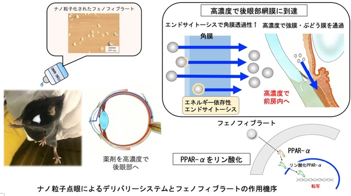従来の点眼薬では眼球の後部にある網膜まで薬剤を有効濃度で浸透させることは困難でした。近畿大学薬学部のグループが開発した方法でナノ粒子レベルまで粉砕した点眼薬ではエンドサイトーシスによる角膜での透過性を亢進し、また眼内で強膜やぶどう膜を高濃度で通過することで網膜にまで高濃度で到達することが可能であり、今回の共同研究でこのフェノフィブラートのナノ粒子点眼を世界で初めて作成し、マウスおよびウサギを用いた動物実験において、角膜を透過して前房内に入り、強膜ぶどう膜経路を介して実際に網膜まで有効濃度で到達することを確認しました。