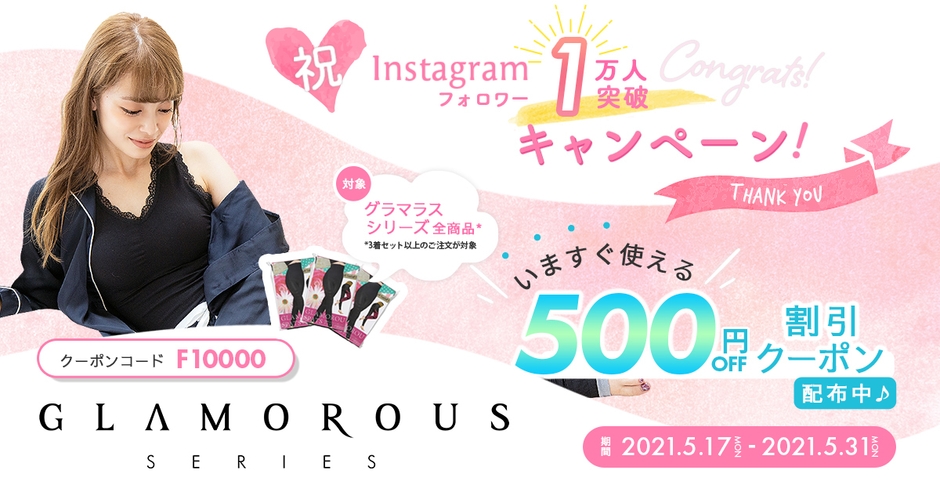 Instagram公式アカウントのフォロワー数「1万人」突破を記念して、グラマラスシリーズの全商品において3着セット以上をお買い上げのお客様に【500円OFF】クーポンを発行。