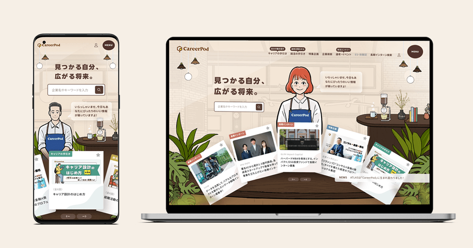 「CareerPod」のサイトコンセプトは「落ち着くブックカフェ」。お気に入りのカフェで作業や読書に集中するように、自分とじっくり向き合う時間を学生たちは過ごすことができます。まだ自分の将来に関心を持てない大学1年生や、就職活動に抵抗感がある学生も、キャリアという一見難しいテーマに親しみを持てるようなデザインとなっています。
