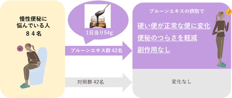 論文名: Prune juice containing sorbitol, pectin, and polyphenol ameliorates subjective complaints and hard feces while normalizing stool in chronic constipation: A randomized placebo-controlled trial