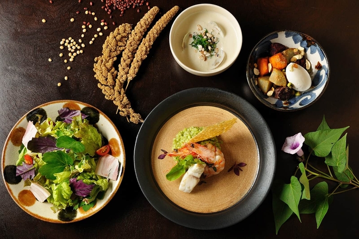 ランチは、五穀の素朴な甘さや味わいを残しながら、フレンチの技法で新しい五穀の楽しみ方を提案するプレートランチです。粟や麦の甘さを感じるリゾット、島豆腐のスープ、収穫した芋のデンガク*1とジーマミー(落花生)を合わせたデザートを提供します。竹富島で大切にされてきた五穀を知り、触れて、味わうランチです。