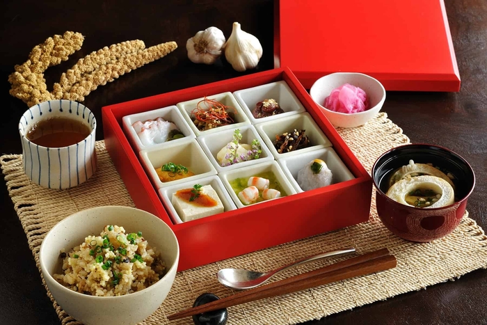 粟を始めとした種子取祭にゆかりある食材を詰めた朝食を提供します。粟を混ぜ込んだじゅーしー(炊き込みご飯)や粟味噌アンダンスー、島ニンニクとタコを合わせたピンダコなど種子取祭ならではの朝食を味わいます。縁起が良いとされるメニューが並ぶ、朝から活力の湧く朝食です。