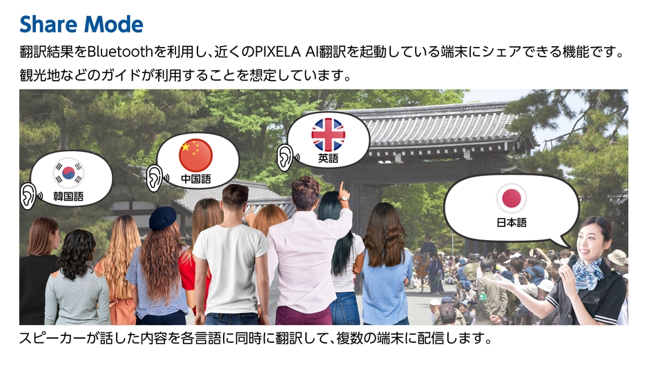 機能追加アップデータでは、観光地などのガイドが利用することを想定した、各言語に同時翻訳を行い、近くの複数端末に配信を行う翻訳共有機能「Share Mode」と、親しみのある表現で翻訳できる「Friendly Mode」を追加いたしました。