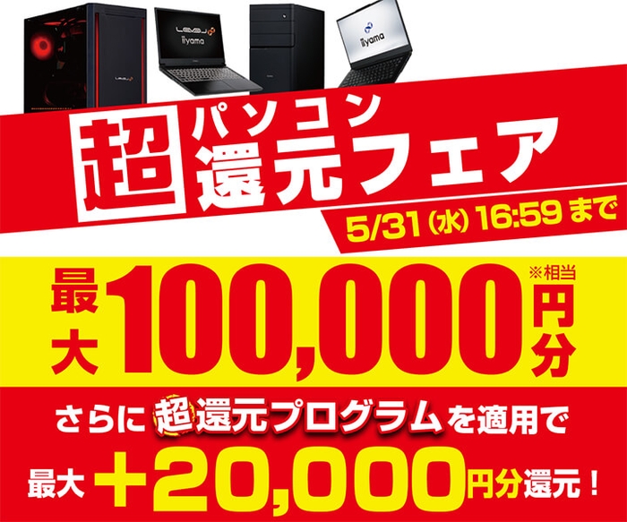 パソコン工房WEB会員またはビジネスご優待会員にご登録の上、期間中に指定金額以上のiiyama PCをお買い上げいただいた方に、最大10万円分相当のWEBポイントを還元いたします。