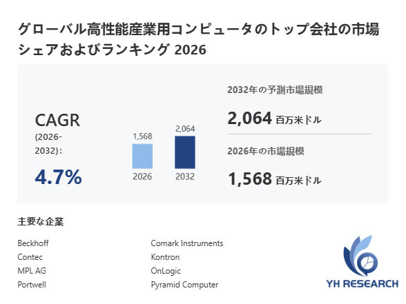 YHResearch調査チームの最新レポート「グローバル高性能産業用コンピュータのトップ会社の市場シェアおよびランキング 2026」によると、2026年の1568百万米ドルから2032年には2064百万米ドルに成長し、2026年から2032年の間にCAGRは4.7%になると予測されています。