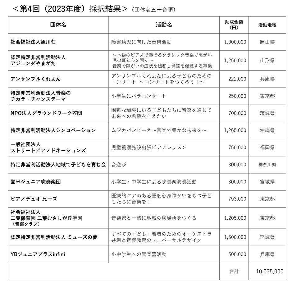 公益財団法人ソニー音楽財団(所在地:東京都千代田区、理事長:水野 道訓)は、「ソニー音楽財団 子ども音楽基金」第4回(2023年度)助成において、「子どもたちへの教育を目的とした音楽活動に取り組んでいる団体」の活動へ、計13件、総額10,035,000円の助成を決定しました。