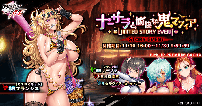 『対魔忍RPG』にて登録者数130万人突破記念を開催!さらにストーリーイベント「ナーサラと愉快な鬼マフィア」で【カチコミギャル】フランシスをGET!