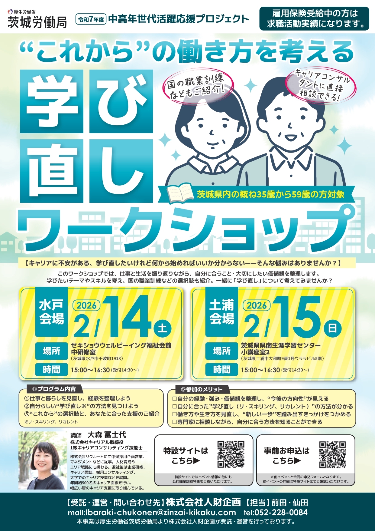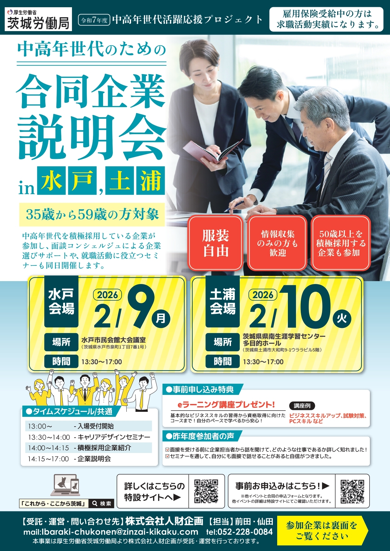 株式会社人財企画は、「令和7年度中高年世代活躍応援プロジェクト」(厚生労働省 茨城労働局)の受託事業として、2026年2月9日(月)に水戸市・水戸市民会館にて、2026年2月10日(火)に土浦市・茨城県県南生涯学習センターにて「中高年世代のための合同企業説明会in水戸,土浦」を開催いたします。