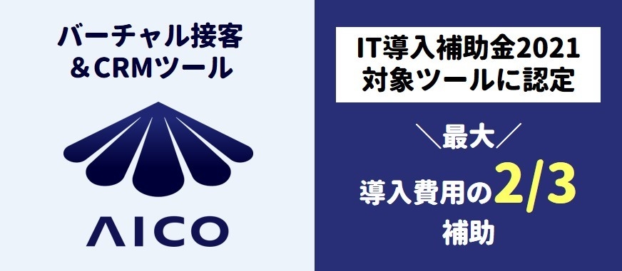 株式会社スマートウィル(本社:東京都港区、代表取締役社長:坂本 雅志、以下「スマートウィル」)が、「IT導入補助金2021」のIT導入支援事業者に採択されたことに伴い、自社サービスのバーチャル接客&CRMツール『AICO』が同補助金の対象ツールとして2021年7月27日に認定されました。これにより、本サービスの導入にかかる費用の最大2/3の金額を補助金として受け取る事が可能となります。