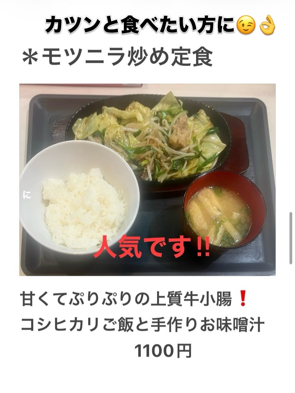上質な牛小腸を使用したスタミナ満点の定食。コシヒカリのご飯と手作り味噌汁付き。