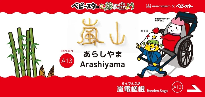 鉄道会社と菓子・食品製造販売会社という異業種のコラボレーションにより、嵐電の制服を着用したベビースターキャラクター「ホシオくん」と、嵐電マスコットキャラクター「あらん」を使用したデザインで、嵐電の車両や駅を装飾し、スタンプラリーや、嵐山駅飲食店舗でのベビースターを使ったアレンジメニューの提供などを実施、嵐電ご乗車のお客様はもちろん、沿線の皆様にも、驚きとワクワクをお届けします。