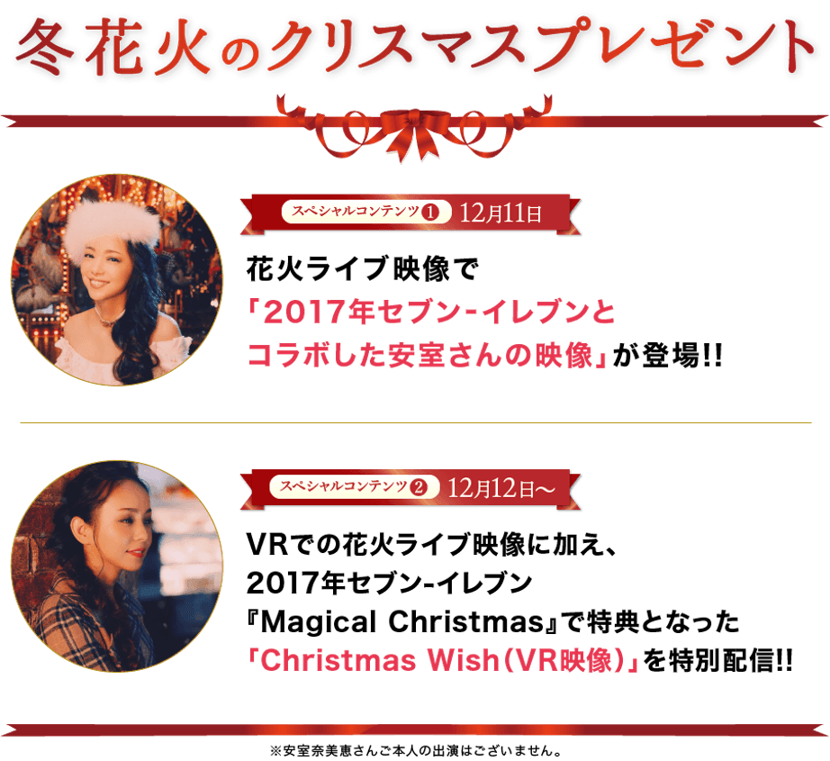 なおVRオンデマンド配信では第2部のWE LOVE NAMIE HANABI SHOWのライブ映像に加え2017年セブン-イレブン「Magical Christmas」で特典となった「Christmas Wish(VR映像)」を特別配信いたします。