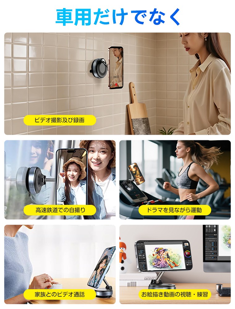 本製品は、走行中の振動によるスマホの揺れや落下、吸盤の外れやすさ、角度調整のしづらさといった従来の車載ホルダーの課題を見直し、安定性・操作性・設置自由度を追求した次世代モデルです。