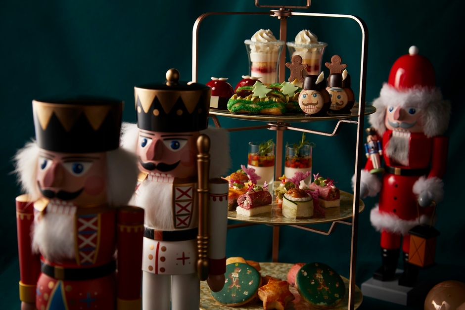 今年は世界のクリスマスケーキをテーマに、ショートケーキ、シュトーレン、エクレア、サンタクロースのムースなどのほか、今年の主役であるくるみ割り人形が描かれたマカロンがスイーツに登場。セイボリーは、クリスマスツリー形の楚蟹のサンドイッチ、雪に見立てた白いトマトコンソメを添えた帆立と雲丹の贅沢な逸品、コンソメジュレとキャビアを添えた旬のカリフラワーのムース、国産牛のローストビーフなど、クリスマスに相応しい豪華なラインアップに。クリスマスの鮮やかな色合いで、目でも楽しめるホリデーティータイムをご堪能ください。