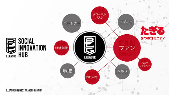 B.LEAGUEがクラブ・パートナー企業と共にステークホルダーを巻き込みながら“Hub”となり、5つのコミュニティをたぎらせ、持続的な経済発展とSocial Impactを実現するプロジェクトのこと。