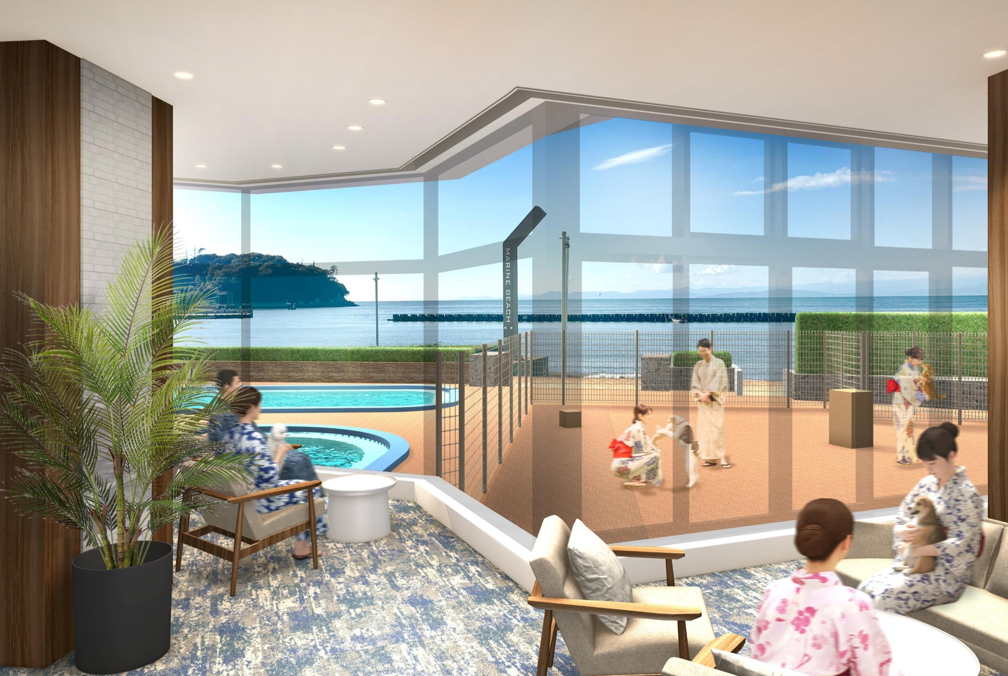 プールデッキの一部を改修し約200㎡の屋外ドッグランを新設いたします。わんちゃんも自然の潮風を浴びながら遊ぶことができます。館外へはロビーから出入り可能で、わんちゃん用の足洗い場も設置します。また、天候を問わず楽しめる約35㎡の屋内ドッグランも新設いたします。