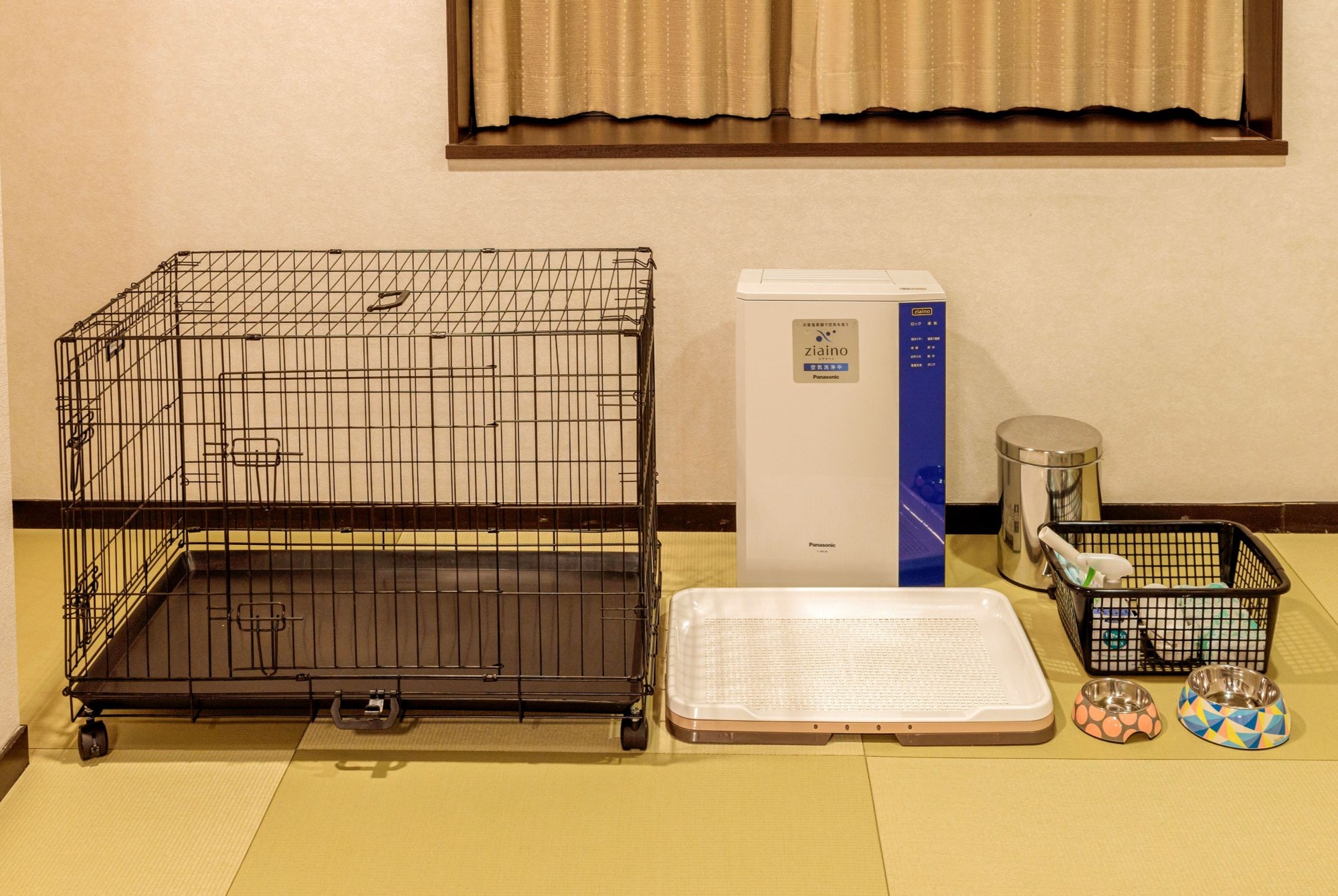 全室がわんちゃんと宿泊可能な客室となっております。リニューアルに伴い、わんちゃんの足腰に負担がかからないよう客室の畳やカーペットなどを張り替え、衛生対策のための「空間除菌脱臭機 ジアイーノ」も設置。あると便利なわんちゃん用のエチケットアイテムもご用意いたします。
