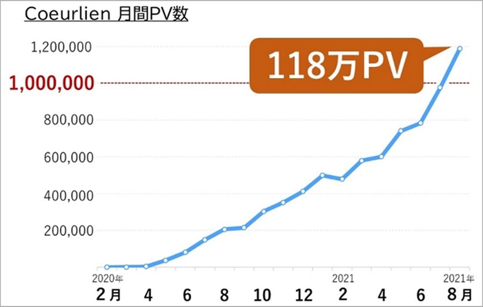 2020年1月にスタートしたCoeurlienは、2021年1月には月間50万PVを、8月には同100万PV超の118万PVに達しています。