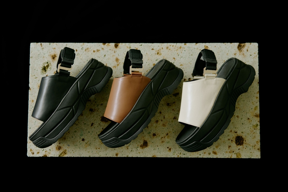 リラックス感とモダンなムードを兼ね備えた今作は、アッパーに微光沢PUレザーのワイドなワンストラップを使用。