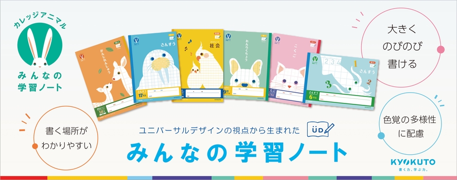 この度『カレッジアニマル学習帳』に、ユニバーサルデザインの視点から本文罫をより使いやすく改良した新シリーズ“カレッジアニマル みんなの学習ノート”を2024年6月上旬より順次発売いたします。