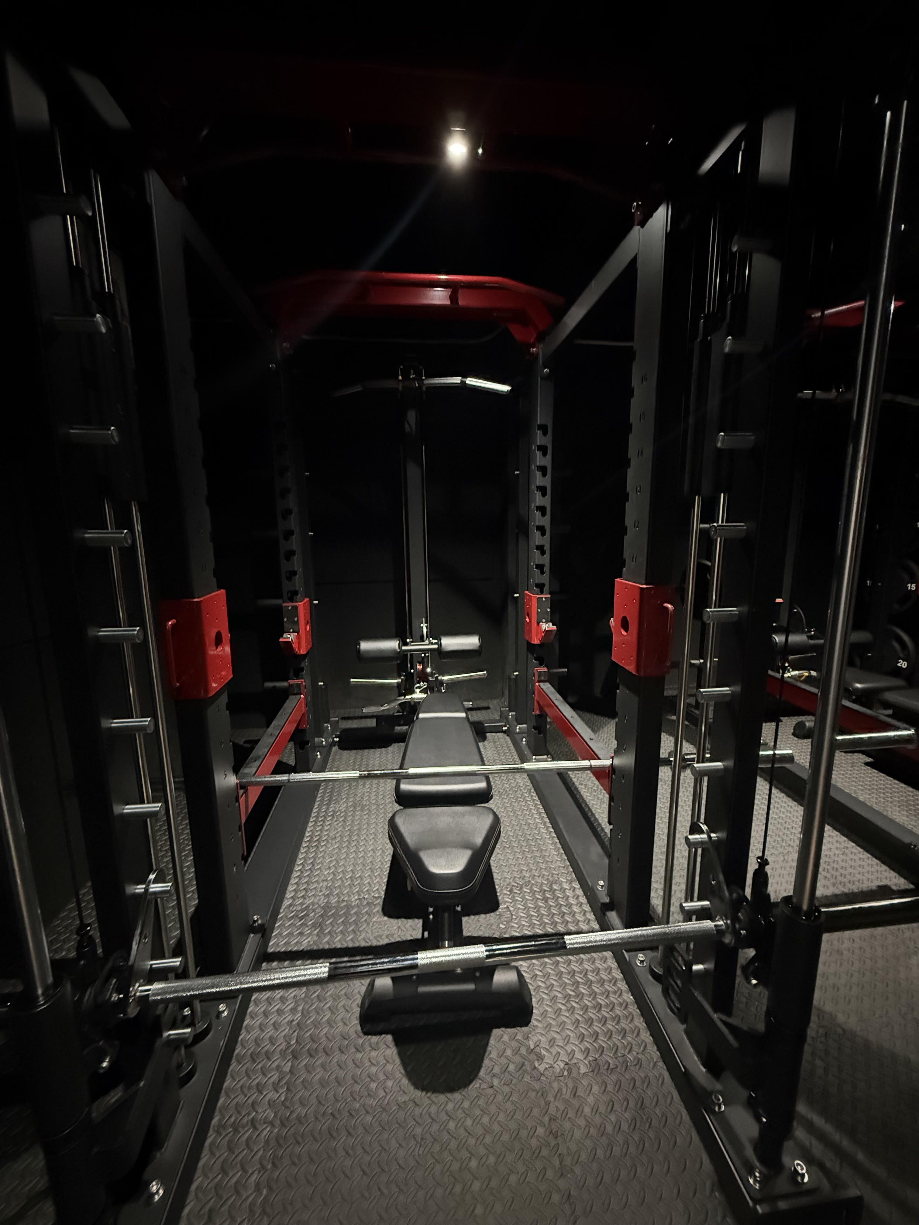 フリーウエイトを従来のマシンの外で行う設計ではなく、ラックの中で行える安全設計