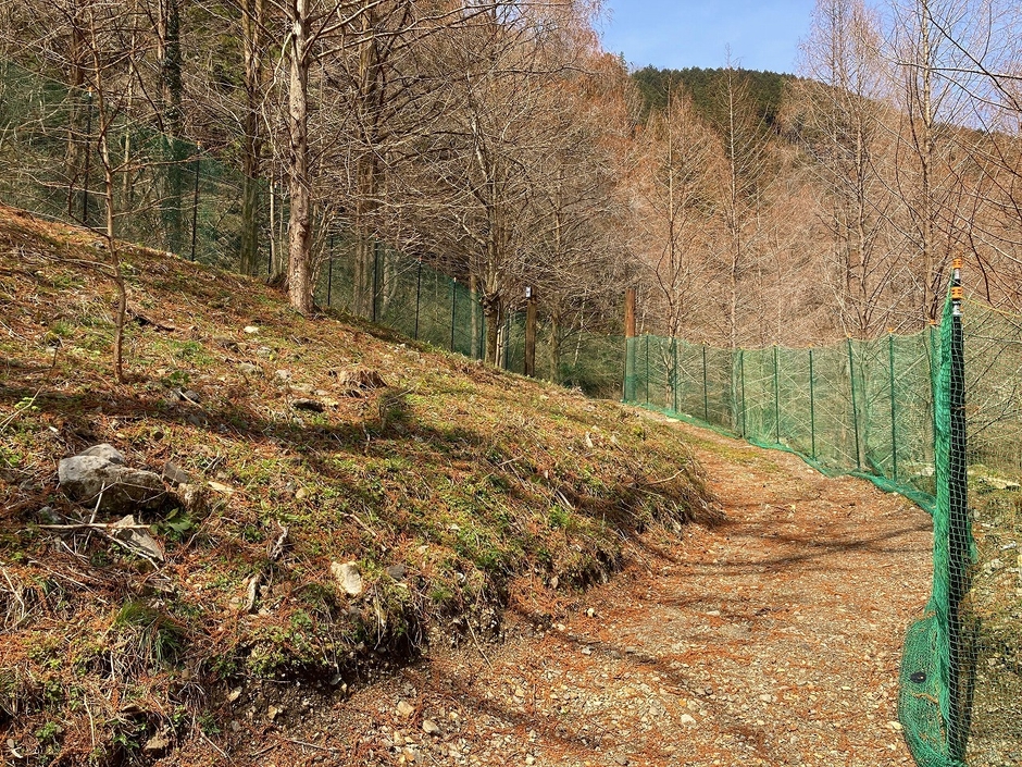 平面のドッグランが一般的に普及していますが、野生の血が濃く残る和犬にとっては、それでは十分なストレスを解消出来ていないのではないかと飛鳥苑長が日頃考えていたことが、地の利を活かした里山の活用方法につながりました。第1期工事分、全長150mの周回コース(面積250平米)が完成しました。