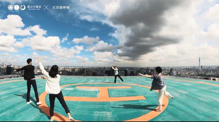 地上160メートルのビルの屋上で、朝の清らかな空気の中、深呼吸をしながら気功をベースにしたオリジナルの運動を行います。大きく開けたビルの屋上からは、眼下に広がる東京のビル群やスカイツリー、東京タワーも臨むことができます。