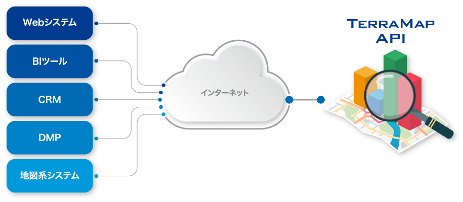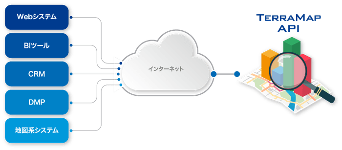 TerraMap APIとは、エリアマーケティングデータ(統計データ、ポリゴン、住所)を自社で用意せずに自社システムに組み込みたい方向けの地図システム開発支援Web APIです。