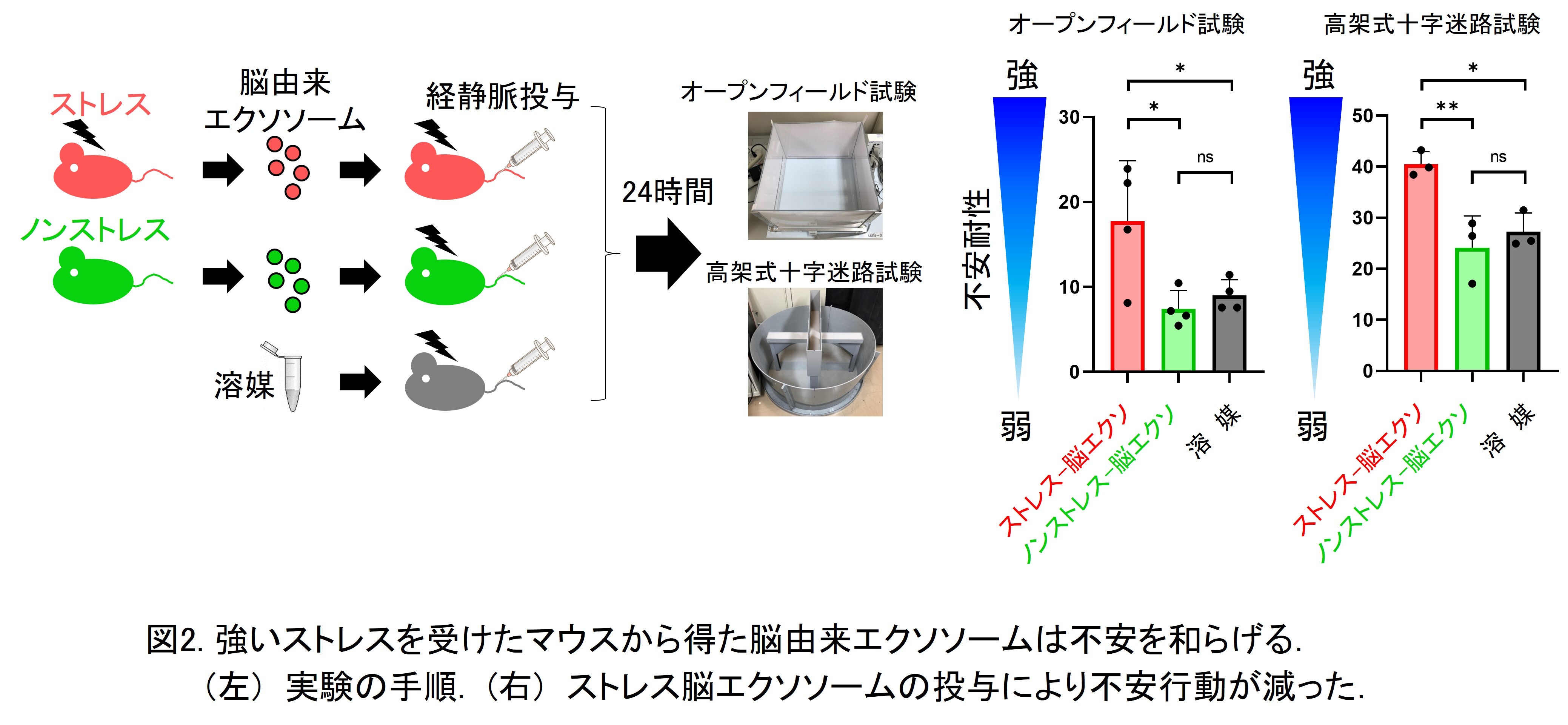 水浸拘束ストレス(1時間)を与えたマウスの血液から、脳由来エクソソームを回収しました(図1)。このエクソソームを別のマウスに静脈内または脳室内投与したところ、オープンフィールド試験および高架式十字迷路試験において、不安が弱まったときに特徴的にみられる行動(不安を感じるエリアでの行動の増加)が確認されました(図2)。次に、エクソソームの中身(マイクロRNA)を詳しく調べると、miR-199a-3pとmiR-99b-3p、miR-140-5pが顕著に増加していました。これらの3つを人工的につくって混ぜたものをマウスに投与すると、同じように不安が和らぐ効果が見られました。