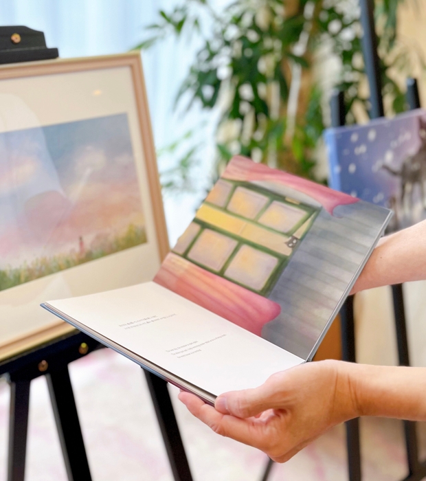 『かいねこきぶん』は、令和5年度の京都市立中学校の推薦図書となった絵本。夫がストーリーと絵を担当し、妻が色塗りを担当したご夫婦の合作です(いろどりあつめ作 ※下記参照)。その、いろどりあつめの絵画を、CAFETEL館内のあちらこちらに展示し、CAFETELがギャラリーと化すことに。1階のカフェもこの期間は、ギャラリー目的にお越しいただくことができ、絵画を見るためだけにカフェに立ち寄ることが可能です(営業時間下記参照)。温かなカフェの空間で、絵の世界に浸る・・・ほっこりあたたまる時間をお過ごしください。