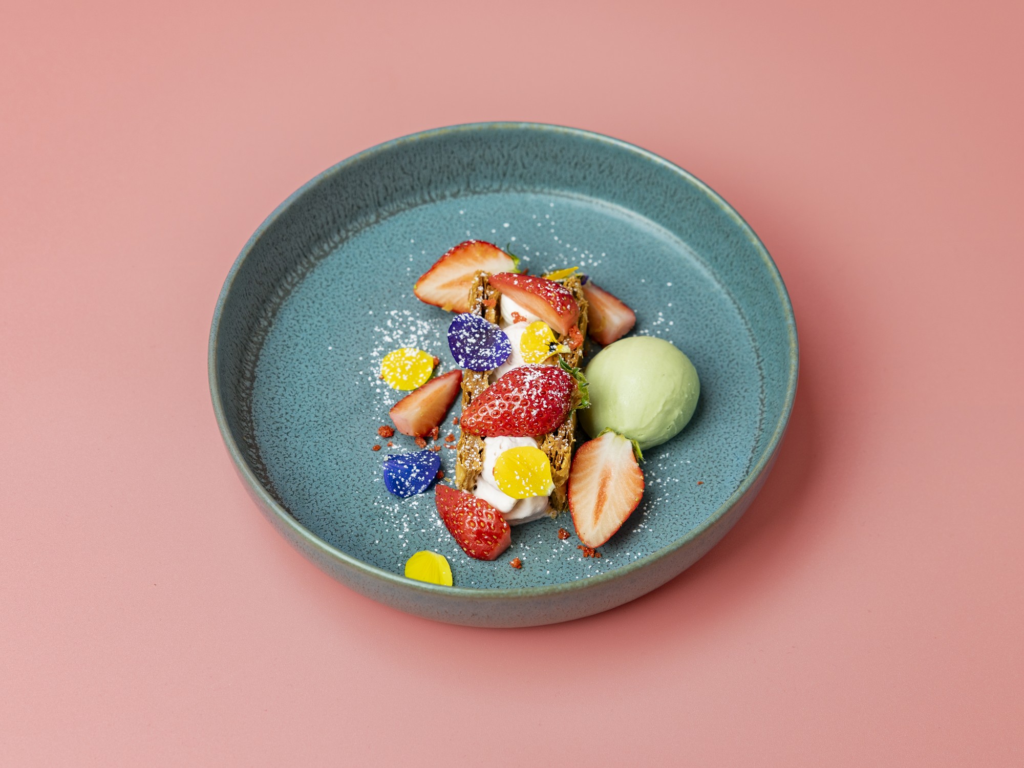 ローズコンフィでマリネした苺の香りとフレッシュの苺のみずみずしさ、2種類のクリームとサクサクのパイ生地の食感のコントラストをお楽しみください。