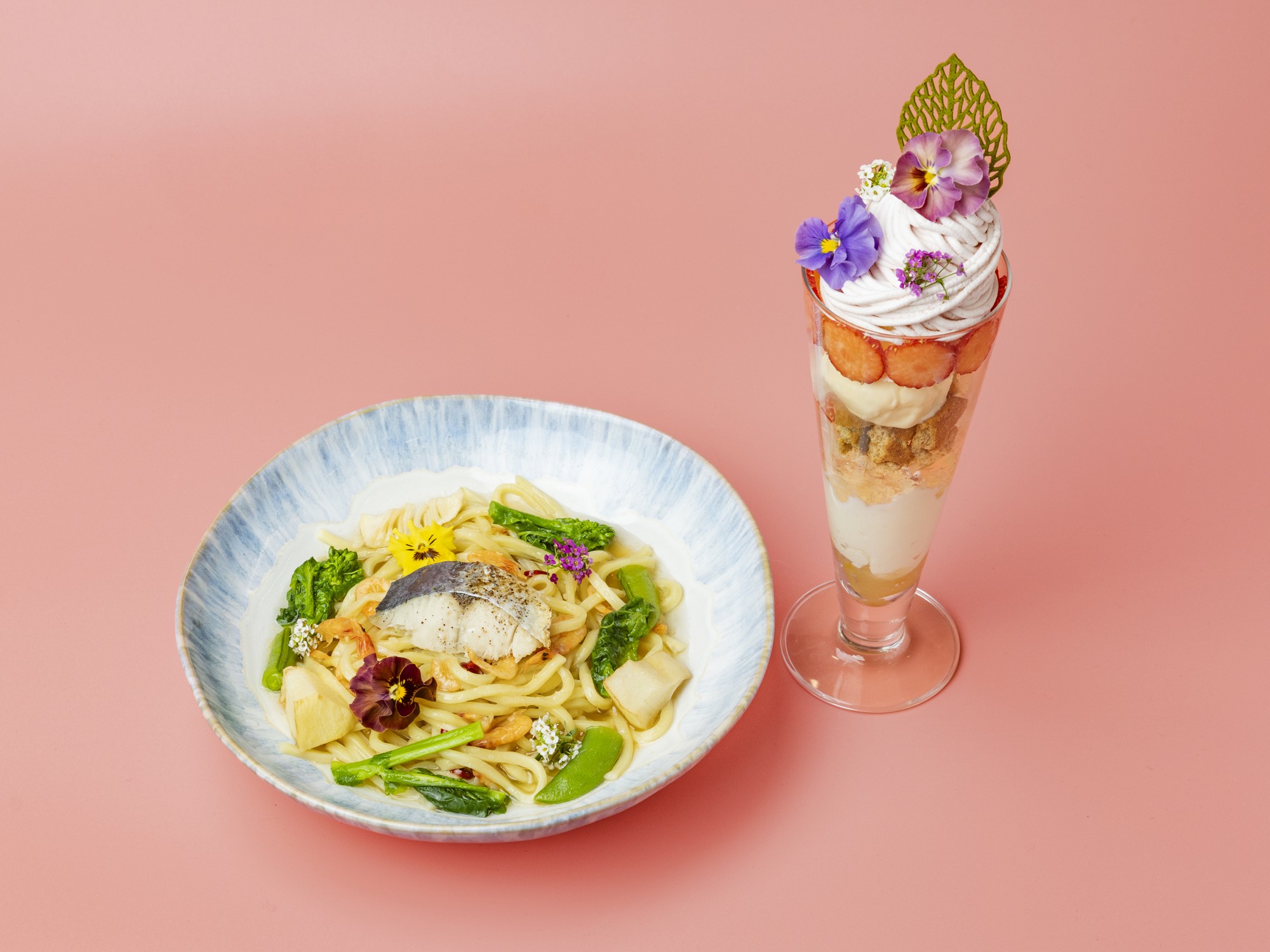 桜エビと鰆のペペロンチーノ、お花と季節野菜のスープ仕立て 1,600円(税込)
