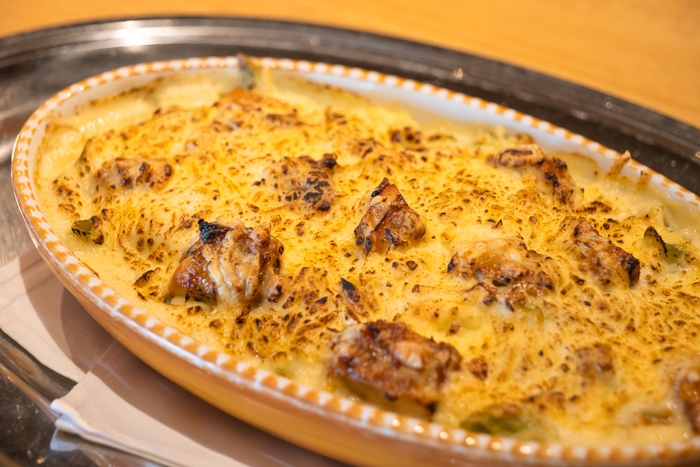 自家製ベシャメルソースのやさしいコクに、チーズの香ばしさが重なる冬の定番。とろりとしたソースと焼きたての香りが食欲を引き立てます。