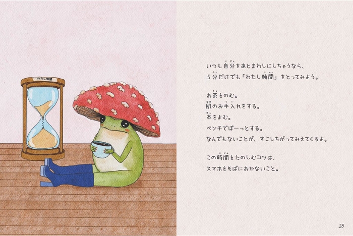 背中をおしてほしいとき、ただ寄り添ってほしいとき、キノコカエルが、そっと言葉をかけてくれます。