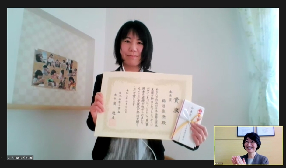 10月25日(月)、オンラインにて会長賞の表彰式を行いました。表彰式には、日本歯磨工業会 事務局長・菊原和幸、同 広報委員長・鈴木久美子(サンスター株式会社)が出席し、鈴木広報委員長より賞状と賞金10万円が受賞者の鵜沼佳澄さんに授与されました。