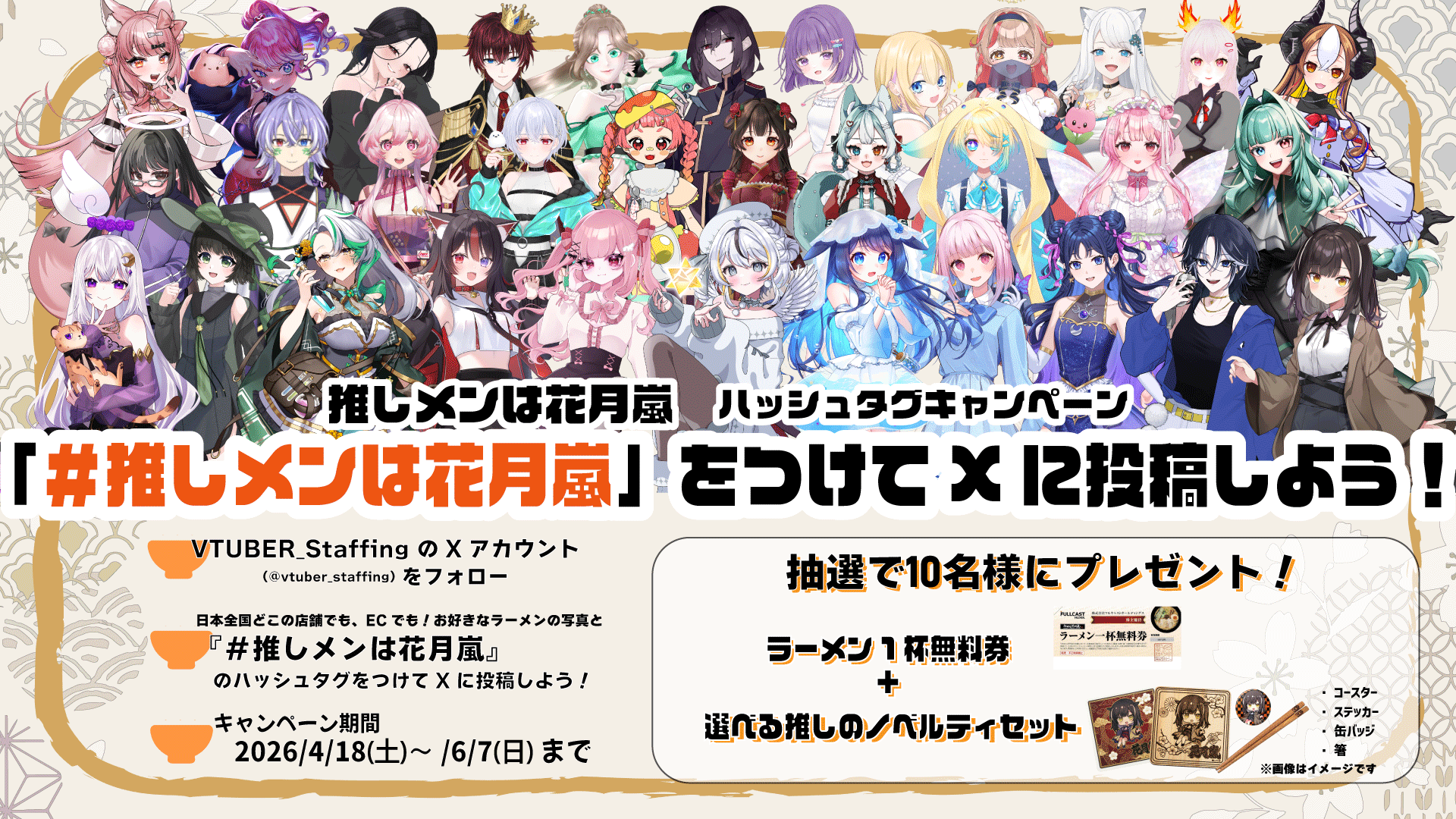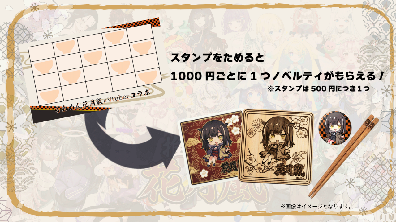 店舗にて直接Vtuberの接客を体験をした方も、コラボ開催店舗以外でラーメンをご注文された方も、店舗に来店せずにECサイトでコラボラーメンをご注文いただきました方も、Vtuberが接客している写真・動画や、ご注文頂いたラーメンの写真とハッシュタグ「#推しメンは花月嵐」とを一緒に投稿することにより、抽選で10名様にラーメン1杯無料券+ランダムステッカー+ランダムクリアカードが当たります。(※キャンペーンとノベルティの詳細等はLPサイトをご確認ください。)
