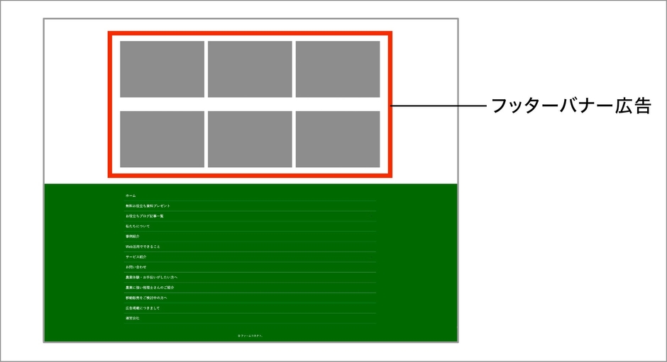 パソコンビューではフッター上、スマートフォンビューではフッターにバナー画像を表示するメニューです。全階層のページに表示されます。