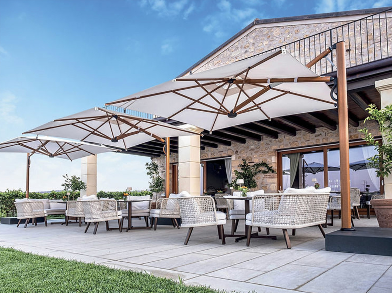 1974年、イタリアヴェネツィアのほど近くにて創業。デザイン性と機能性を追求したパラソルは、大空間を美しく演出。厳格な品質チェックを伴った製品は、世界中で愛され続けている信頼の源となっています。洗練されたデザインと徹底した品質管理でハイクラスホテルや高級レストランのみならず、街のカフェや個人邸など幅広く利用いただいています。