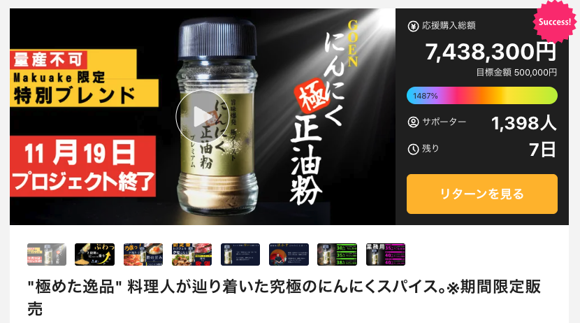 「極ニンニク正油粉」は、目標金額50万円に対し、わずか数週間で750万円を突破。