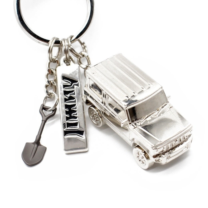 付属のスコップ型フィギュアやJIMNYロゴプレートなど、随所に遊び心をプラス。キーチェーンとして使用すると、各パーツが触れ合い金属音が鳴り響き、まるで“熊よけの鈴”のような存在感を発揮します。